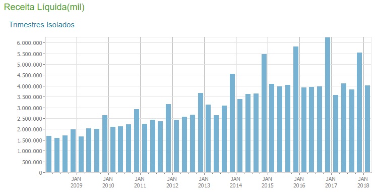 Para isso, o portal Fundamentus é uma boa alternativa e, por ser uma ferramenta gratuita, atende de maneira bastante relevante investidores pessoa física. Segue abaixo um exemplo dos dados de receita líquida da Lojas Americanas ao longo do tempo.