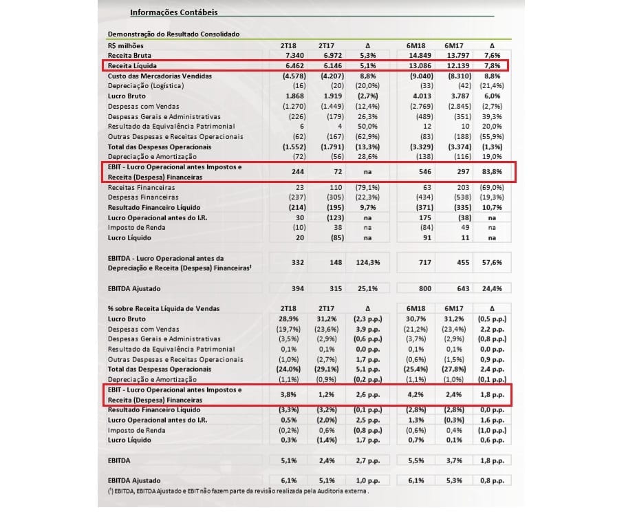 Tome-se como exemplo o caso da Via Varejo (VVAR11), através dos seus resultados operacionais referentes ao segundo trimestre de 2018.