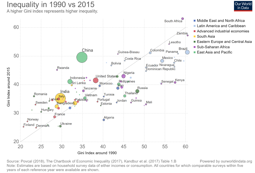 Desigualdade: coeficiente de Gini em 2015 vs coeficiente de Gini em 1990 (quanto maior o coeficiente, maior a desigualdade).