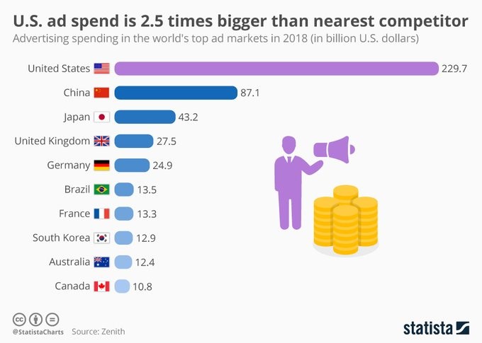Gastos com publicidade nos maiores mercados de anúncios do mundo em 2019 (bilhões de dólares).