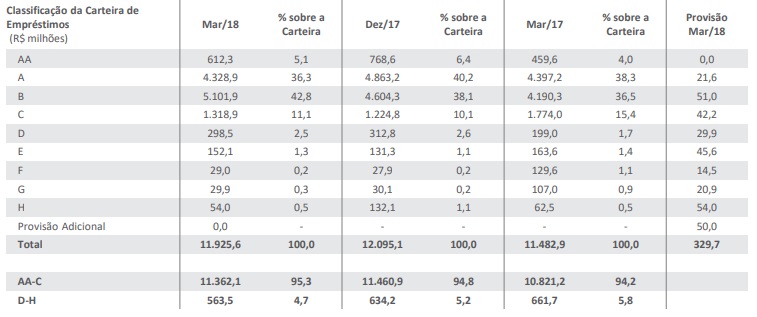 Vale aqui ressaltar que as operações de crédito são classificadas de acordo com seu nível de risco e seguindo critérios que levam em consideração a conjuntura econômica, a experiência passada e os riscos específicos em relação às operações, aos devedores e garantidores, de acordo com tal Resolução 2.682 do Banco Central do Brasil – BACEN. O saldo da carteira de empréstimos ao final de março de 2018 era de R$ 11.925,6 milhões, com um saldo de PDD de R$ 329,7 milhões.