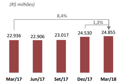 Paralelamente, a Carteira de Crédito Expandida (que inclui as carteiras de empréstimos, garantias prestadas e títulos privados) encerrou março de 2018 com saldo de R$ 24.855 milhões, crescimento de 1,3% no trimestre e de 8,4% em 12 meses.