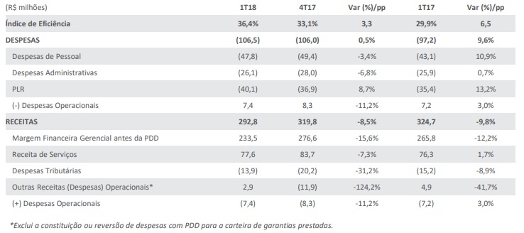 É interessante mencionar, ainda, que a companhia apresentou um Índice de Eficiência recorrente de 36,4% no primeiro trimestre de 2018, variando +3,3 p.p. em relação ao trimestre anterior e +6,5 p.p. se comparado ao mesmo período de 2017.