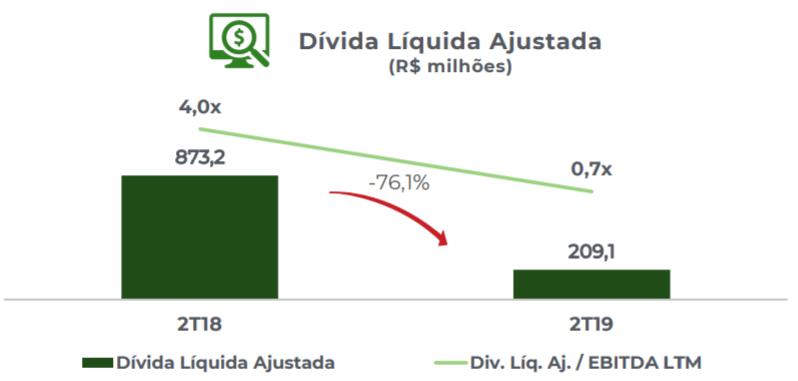 A empresa também apresentou, no segundo trimestre de 2019, uma redução de 76,1% na dívida líquida ajustada, alcançando o patamar de R$ 209 milhões. Deste modo, a dívida líquida ajustada passou de 4 para 0,7 vezes o EBITDA dos últimos 12 meses.