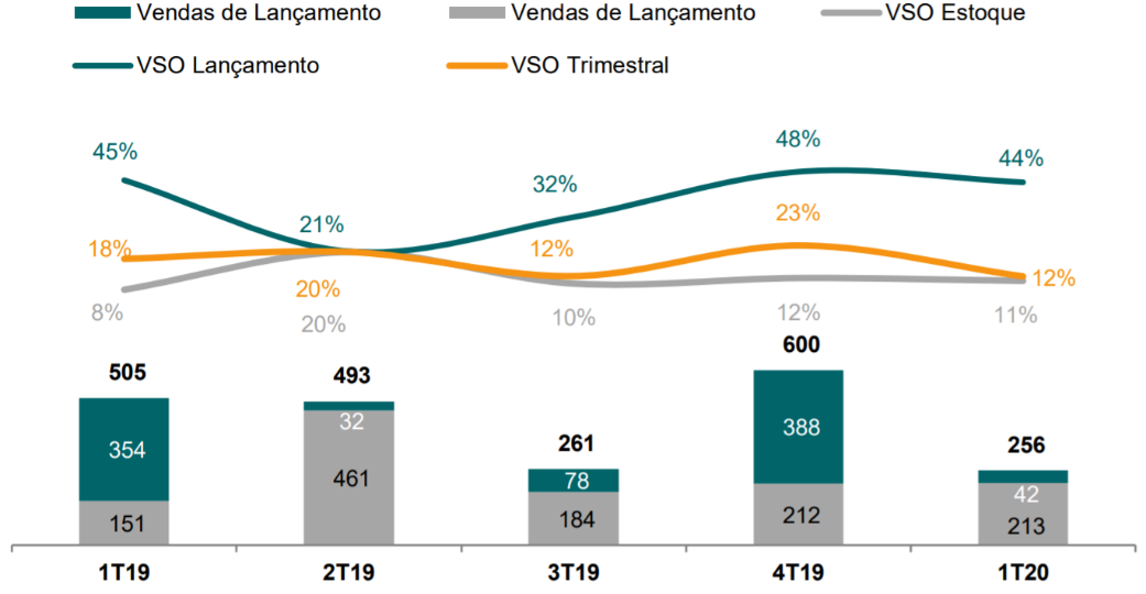 As vendas líquidas do período totalizaram R$ 256 milhões, sendo R$ 42 milhões referentes às vendas dos lançamentos do trimestre com VSO de 44%. Já no mesmo período de 2019, o valor auferido foi de R$ 505 milhões, o que representa uma queda de 49,3% no 1T20.