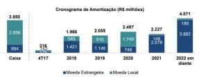 Em relação à alavancagem da empresa, em 30/09/2017, a relação dívida líquida/Ebitda ajustado ficou em 2,3x contra 2,7x em 30/06/2017.