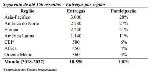 “Enquanto a previsão regional varia significativamente, eficiência e sustentabilidade permanecem como principal motivo da projeção de demanda deste mercado. Neste sentido, o segmento de até 150 assentos vai compor de forma ainda mais integral parte do ecossistema do transporte aéreo global”, ressaltou a Embraer.