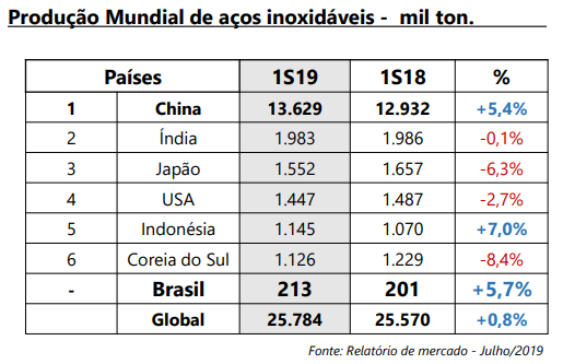 O Brasil, por sua vez, teve um acréscimo de 5,7% na produção de aços inoxidáveis.