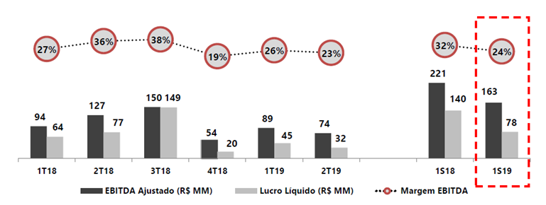 A receita líquida da empresa ficou em R$ 675,5 milhões no 1S19, o que representou uma redução de 3,1% em comparação ao 1S18.