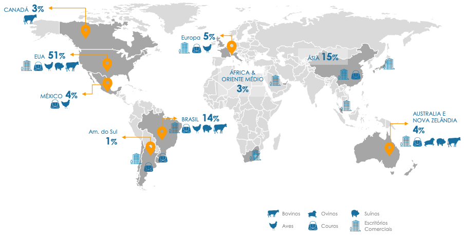 A JBS atualmente está presente em mais de 15 países, com mais de 400 unidades e escritórios.