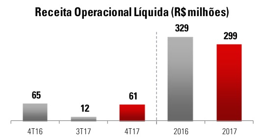 Com isso, a sua Receita Líquida atingiu R$ 61 milhões no 4T17, redução de 7% em relação ao 4T16, resultado do menor volume de vendas líquidas contratadas no período. No acumulado do ano, a Receita Líquida totalizou R$ 299 milhões, redução de 9% em relação a 2016.