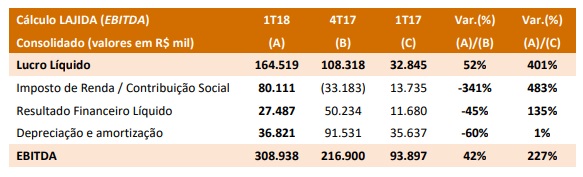 Dessa maneira, no 4T17, a companhia registrou um EBITDA Consolidado de R$ 308,9 milhões, 42% superior ao registrado no 4T17 e 227% superior ao 1T17.