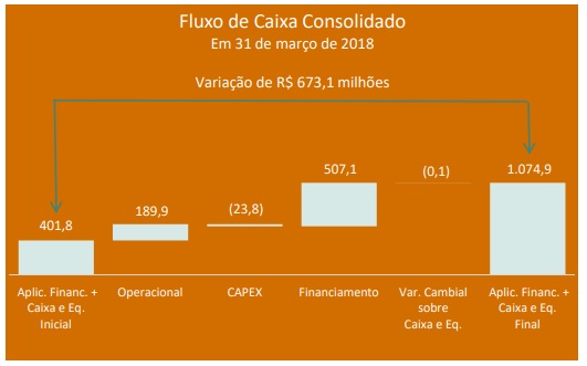 Por fim, em 31 de março de 2018, os saldos das contas Caixa e Equivalentes de Caixa e Aplicações Financeiras foram, respectivamente, de R$ 230,3 milhões e R$ 844,6 milhões. (R$ 78,6 milhões e R$ 323,2 milhões respectivamente em 31 de dezembro de 2017).