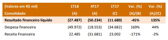 Adicionalmente, o Resultado Financeiro Líquido Consolidado foi negativo no valor de R$ 27,5 milhões no 1T18 versus resultado negativo de R$ 50,2 milhões no 4T17 e resultado negativo de R$ 11,7 milhões no 1T17, devido a variação cambial sobre débitos com terceiros.