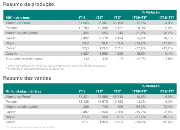 A mineradora destacou, também, que o seu premium e flexível portfólio de produtos é o melhor posicionado para liderar e se beneficiar da tendência de “flight to quality” e que, em linha com sua estratégia, no 1T18 atingiu um novo marco na direção de melhorar o teor de Fe e sua realização de preço.