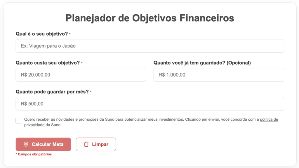 Ferramentas como a calculadora de objetivos financeiros da Suno ajudam a fazer esse planejamento ao estimar quanto é necessário investir por mês para atingir determinada meta.